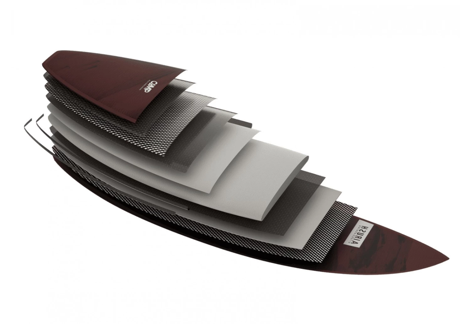 Celui-ci est ensuite pris en sandwich avec un sandwich en PET haute densité recyclé et un pont supérieur en carbone Innegra durable, avec un carbone orienté biaxialement sur le fond. Cette configuration optimise la résistance, minimise le poids et maintient un flex maximum.