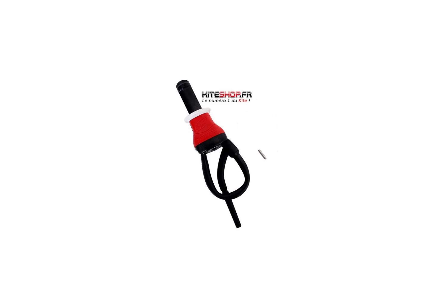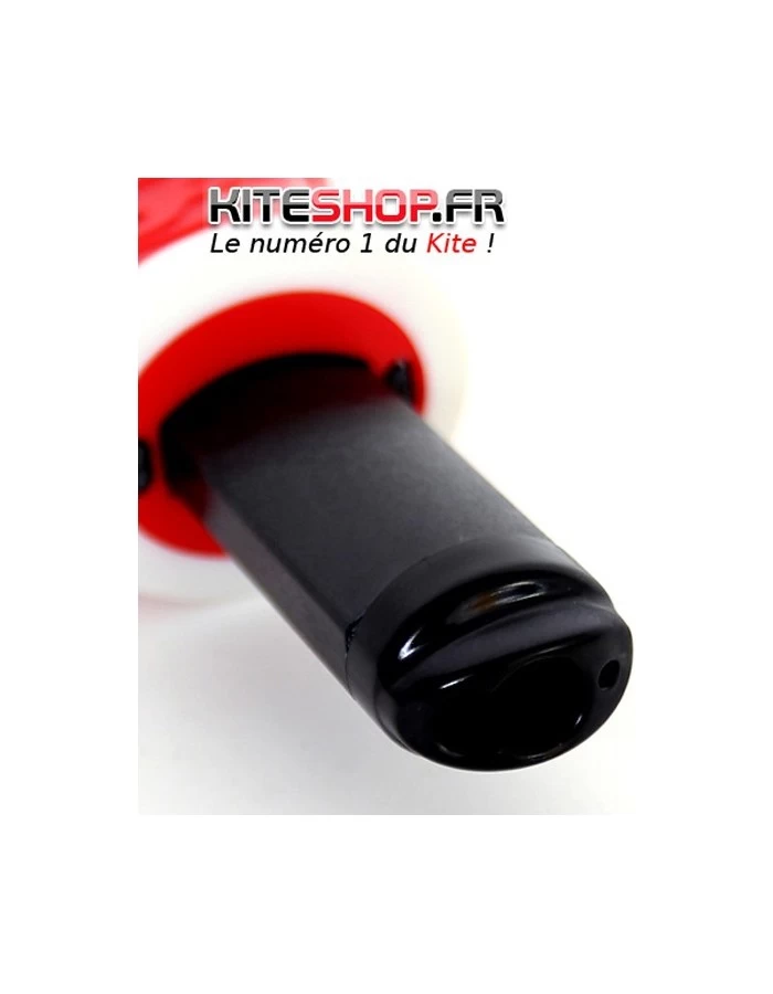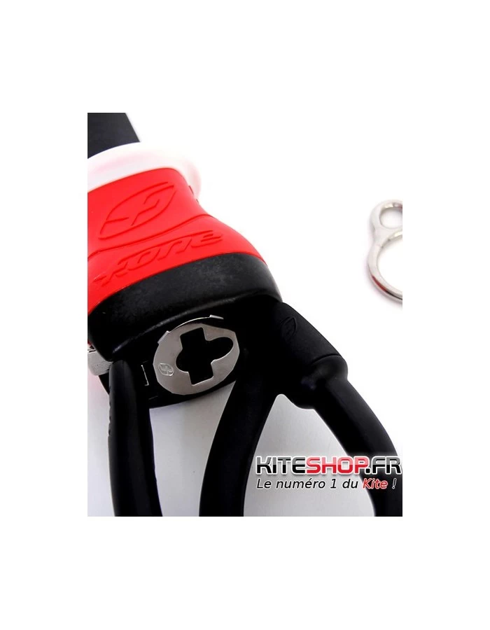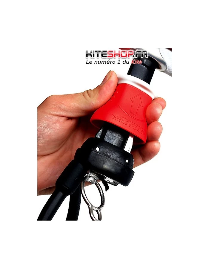 La poignée du largueur a été conçue avec une forme ergonomique permettant de facilement l’agripper pour le déclencher. Une collerette en matière souple a été ajoutée sur le haut de celle-ci pour améliorer le grip et le confort, car lors de la navigation, lorsque la barre est complétement pivotée il peut arriver que les mains du rider viennent toucher le largueur.