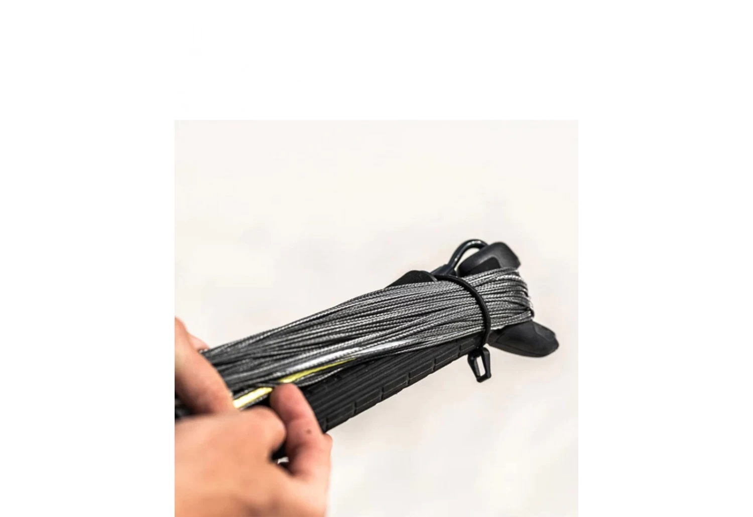 Un relief tridimensionnel du revêtement permet de sentir si la barre se trouve dans la bonne main, lorsque vous effectuez un handlepass en blind. Le look change sous la barre, avec notamment un liseré rouge pour que vous puissiez voir si la barre est à l’envers. La barre en fibres de carbone est livrée de série avec la boucle Pro élargie et 24m de lignes Vario en Tectanium (18+4+2m).